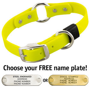 This is the second time I have prefers this collar. It is high quality and well made. I love that it comes with a name plate. It is flexible enough to be very comfortable and easy to put on yet sturdy enough to withstand my active Labrador's activities. We originally bought it because he swims a lot and it dries easily. He also like to roll and it cleans up well. I highly recommend!