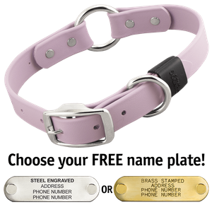 Center metal ring provides flexibility and another point to attach leash. Nameplate is a touch of class and peace of mind. High quality build, recommend!