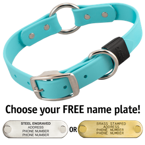 Center metal ring provides flexibility and another point to attach leash. Nameplate is a touch of class and peace of mind. High quality build, recommend!