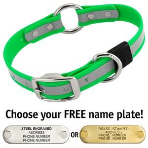 Every dog I have owned gets this collar. I love the hi-viz material. The plastic can be cleaned easily if the dog goes in mud. The name plate is attached securely; I have never had one fall off or be non-readable. I like the "o" ring for attaching a leash. These are great collars and good value for the money. About to order what is probably my 10th one.