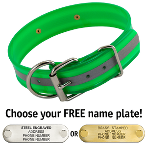 Green 1 1/2" Beaded Reflective D-End Dog Collars and Brass Name Tags