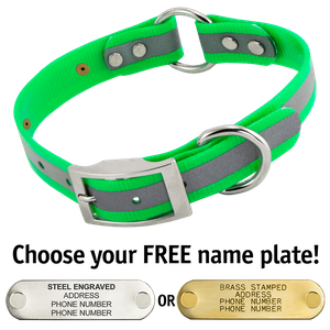 I decided to order a collar that had a stamped and riveted name plate instead of the dangly kind because the silicone ones would rip over time with wear and tear or get chewed/torn off from the dogs playing together and I like that it is one less thing dangling on a key ring from their collar clanking around especially when they hang their heads out of the window on rides. The collar is great and I love the reflective aspect. I will be ordering another one of these for one of my other dogs as well seeing as her silicone one has disappeared now too. The durability over other options simply make it a no brainer for me moving forward. Thank yall so much!