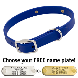 Great collar for the summer when we're jumping in and out of lakes and rivers all the time. Material is soft but strong, doesn't stay wet, pretty color, fits comfortably, and I love the name plate on the collar.