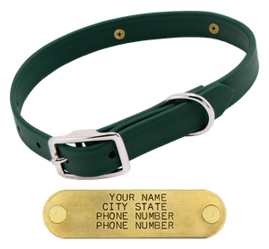 Great collar for the summer when we're jumping in and out of lakes and rivers all the time. Material is soft but strong, doesn't stay wet, pretty color, fits comfortably, and I love the name plate on the collar.