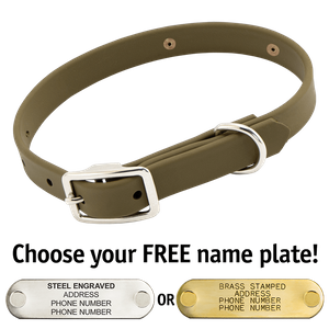Great collar for the summer when we're jumping in and out of lakes and rivers all the time. Material is soft but strong, doesn't stay wet, pretty color, fits comfortably, and I love the name plate on the collar.